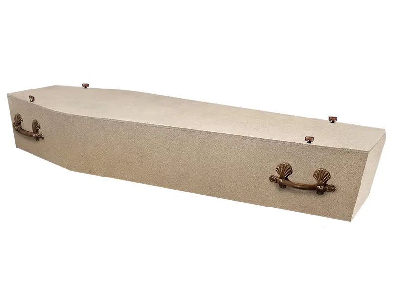 - Custom wood flat lid standard size coffin with four fixed handles and lined with white cotton interior